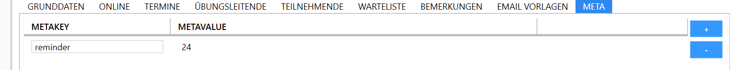 Für Kurse ist es möglich, Erinnerungsmails vor Kursbeginn zu versenden (nicht für Einzelterminanmeldungen). Dazu wird ein MetaKey „reminder“ angelegt und als MetaValue die Zahl der Stunden eingetragen, die die Mail vorher versendet werden soll, z.B. 24 für 24 Stunden. Ausschlaggebend für die Berechnung der Versandzeit ist der Termin, der beim Kurs unter Termine links als Erster Termin ausgewählt ist. Nach dem Versand des Reminders wird die Zahl automatsich auf „x“ gesetzt, sodass der Versand nicht erneut erfolgt.